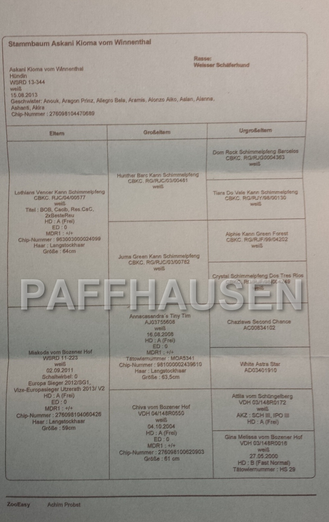 Ahnentafel anklicken zum vergrößern! Unsere Askani haben wir mit 9 Wochen, aus der Zucht "vom Winnenthal" zu unserem Rudel hinzu geholt. Sie hat sich schnell eingelebt und zu einer traumhaften Langstockhündin mit viel Charme und Esprit entwickelt. Auch ihre Gesundheitswerte sind super ausgefallen HD, ED, Schaltwirbel frei! Durch ihre Eltern ist ist sie ebenfalls MDR1 Gendefekt frei. Sie weißt eine tolle Ahnenreihe vor, die unsere Zuchtstätte hoffentlich bereichern wird. Ihren ersten Wurf hatte sie 2015. Ihre Welpen haben sich toll entwickelt. Nach Askanis letztem Wurf ging sie in Zuchtrente. Danach kam sie mit Chaya nicht mehr aus. Und es gab immer wieder Rangeleien. Deshalb haben wir uns letztendlich dazu entschieden, Askani zu Freunden zu geben. Dort wird sie als Einzelhund verwöhnt und vertüddelt. |