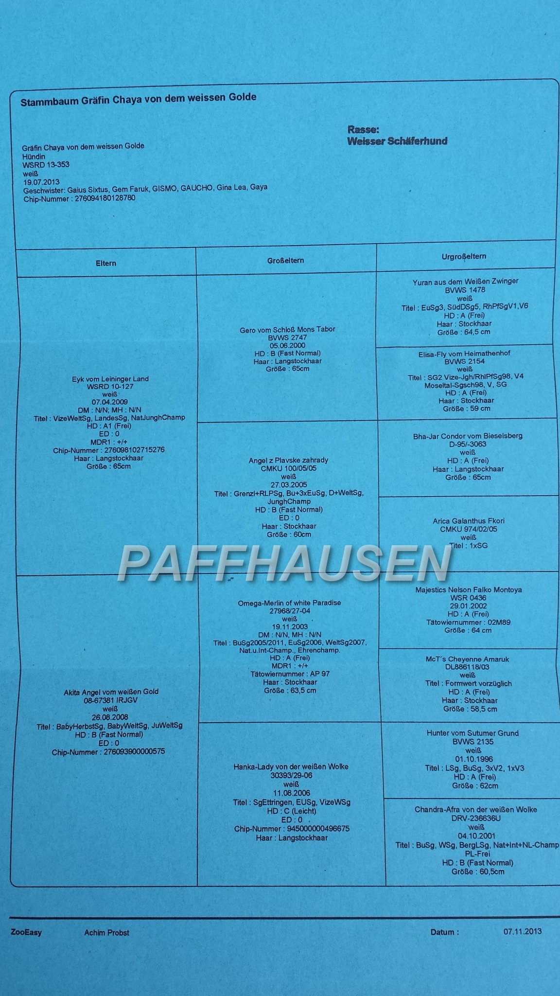 Unsere Nachzuchthündin aus unserem G Wurf hat sich toll entwickelt Eine Stockhaar Perle unter den Weißen Schäferhunden. Chaya ist mischerbig. Das heißt sie kann auch Langstockwelpen mit einem mischerbigen Stockhaar oder Langstock Rüden hervorbringen! Durch bedachter Zucht, einkreuzen von neuen Linien trägt sie zudem noch interessante Ahnen in sich, die für die Zucht eine Bereicherung darstellen. Sie ist auf HD, ED und Schaltwirbel geröntgt und alle Befunde sind frei! Chaya ist Alle Unterlagen können bei uns eingesehen werden.